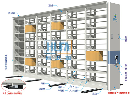 密集架按結(jié)構(gòu)分類有兩種形式,半封閉式密集架和全封閉式密集架,海發(fā)HF-MJFB051號密集架就是全封閉式密集架。全封閉式密集架主體由立柱、層板、頂板、底板、節(jié)間側(cè)板、節(jié)與節(jié)之前的封板和最外側(cè)護(hù)板、列門板等組成,比半封閉式密集架多了私密性,因此主要用于存放私密性較強(qiáng)或較小物品的存儲。